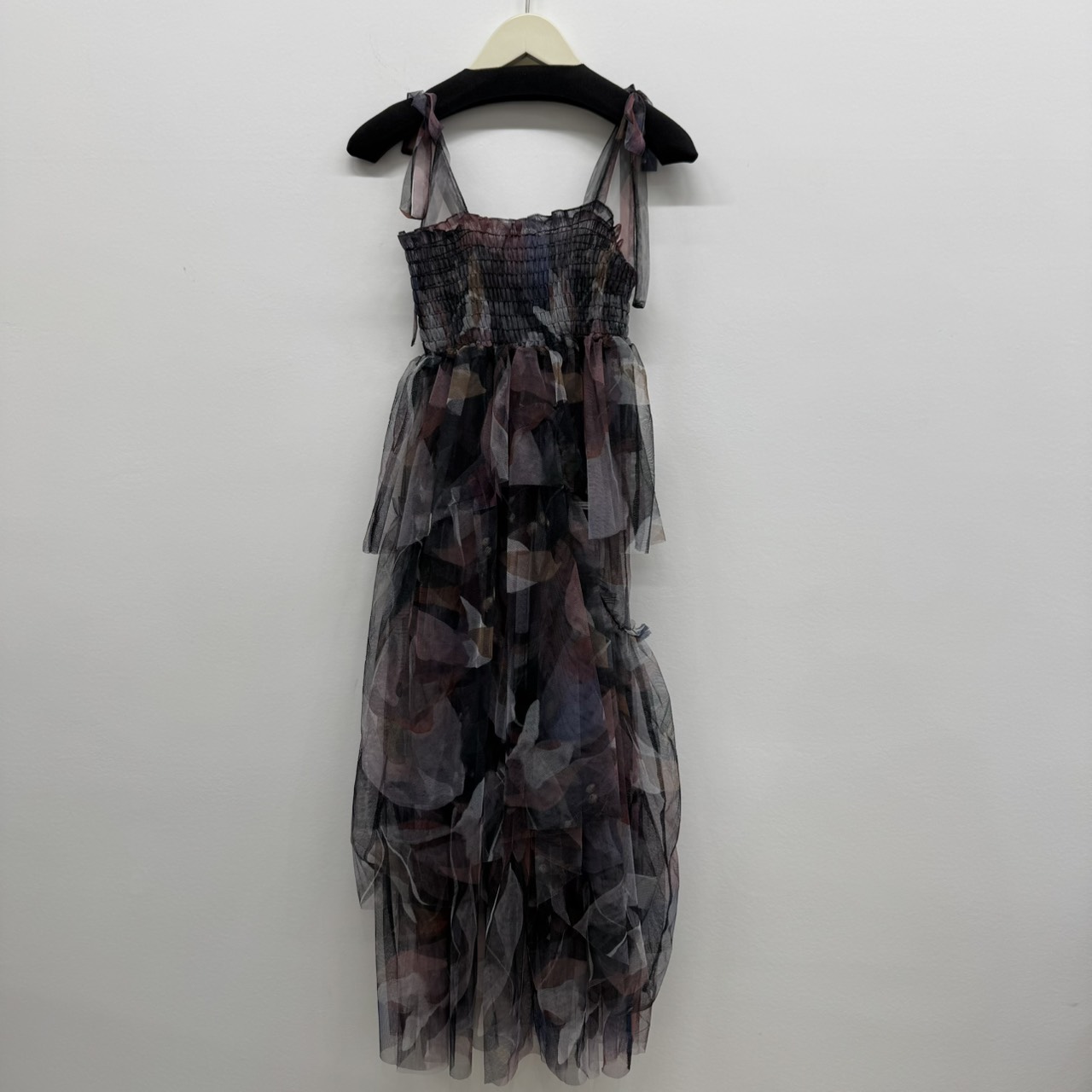 華やかなチュールスカートです! プリントチュール生地で作ったダンドールスカートは、肩ヒモ付きなので、ウエストを胸元まで上げてワンピースとしても着られる2WAY仕様です。ダンドールの一部をふらして動きをつけてます!
