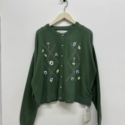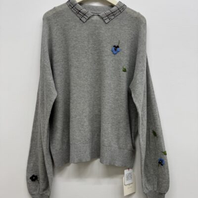 太い糸でふんわりと手刺繍されたパンジーのお花。 強撚糸を使ったカノコ編みの綿ニットはしゃりっとした軽いタッチ。 カジュアルにも着こなせる襟付きニットは、胸元のワンポイントと...