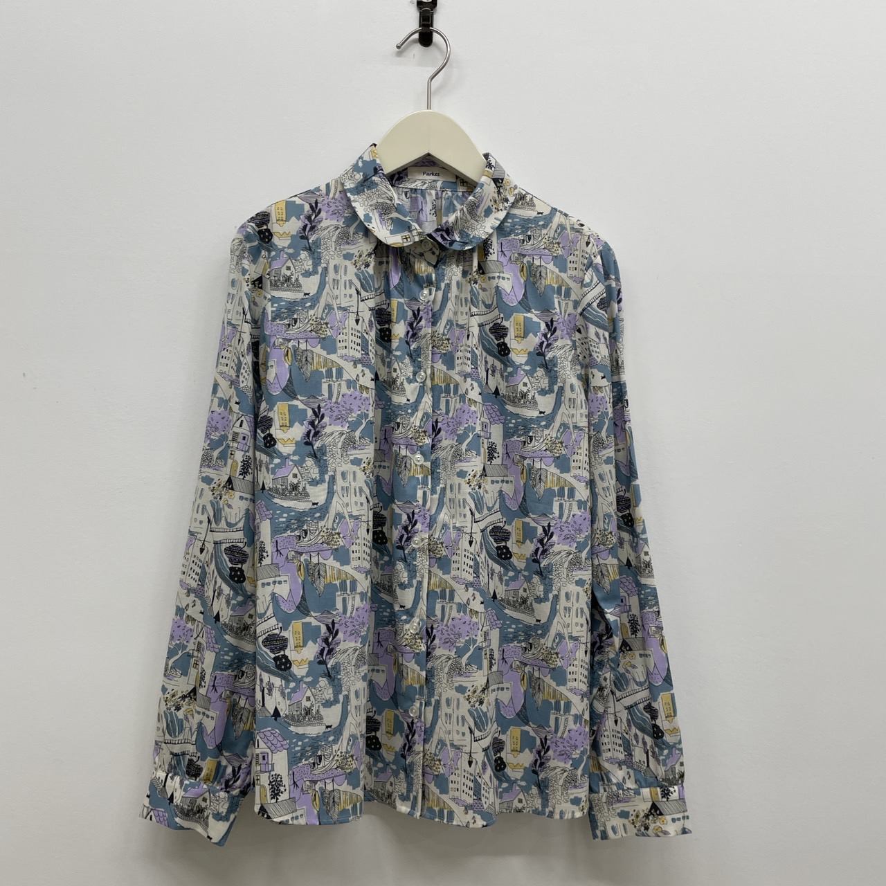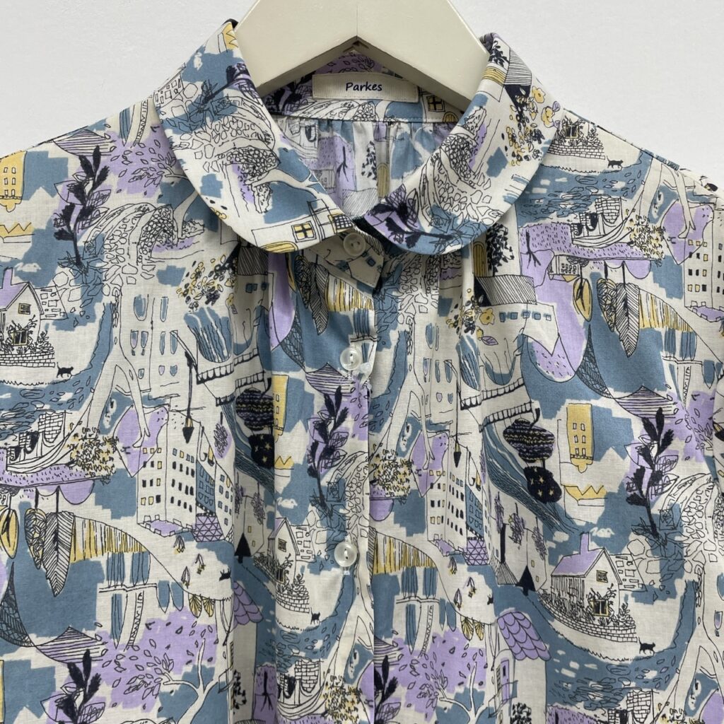 60ローン ネコの歩く町 丸衿ギャザーブラウス