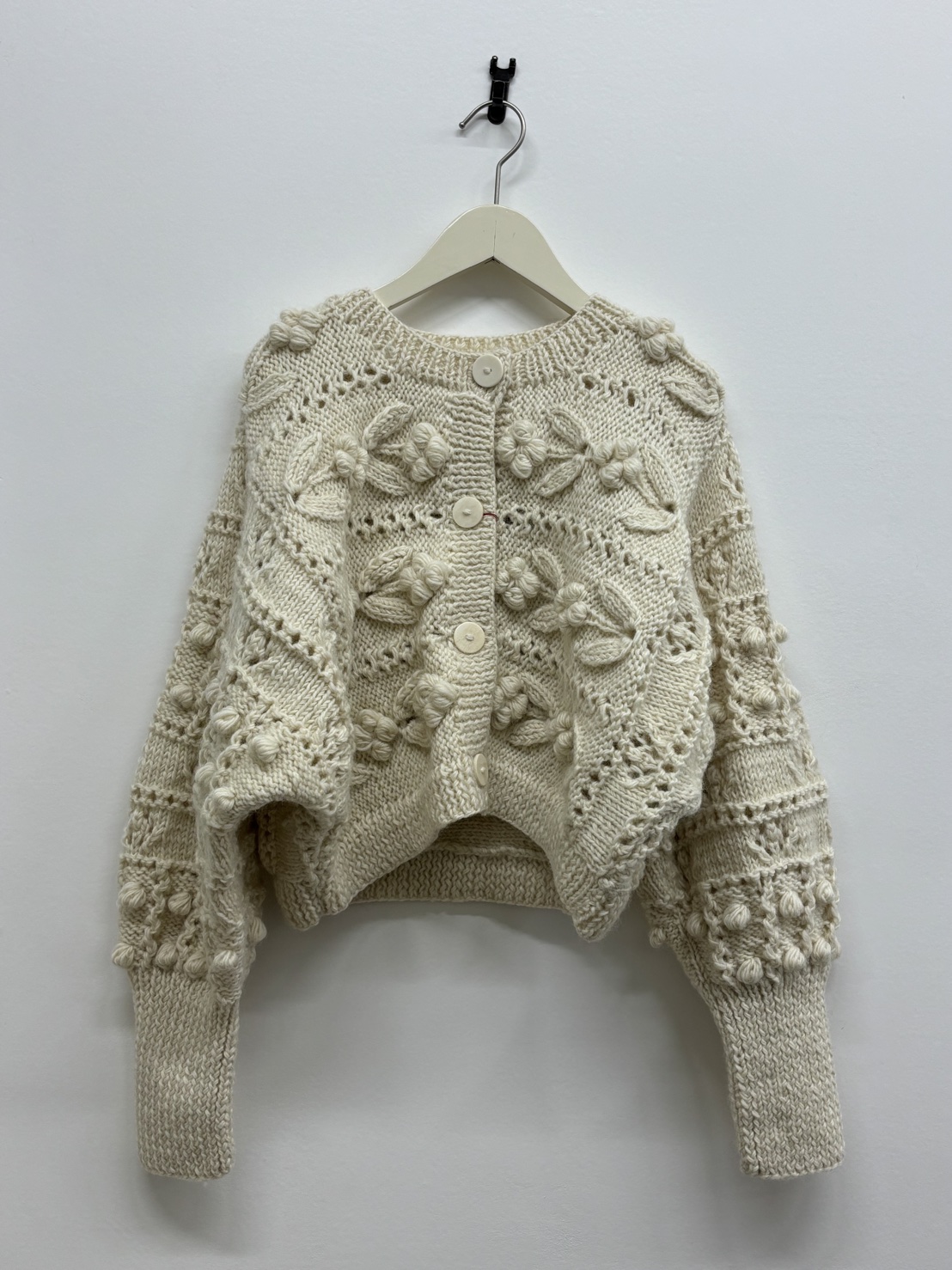 ぽこぽことした立体的な編みや透かしなどさまざまな編地を組み合わせたノスタルジックなニットカーディガンです!