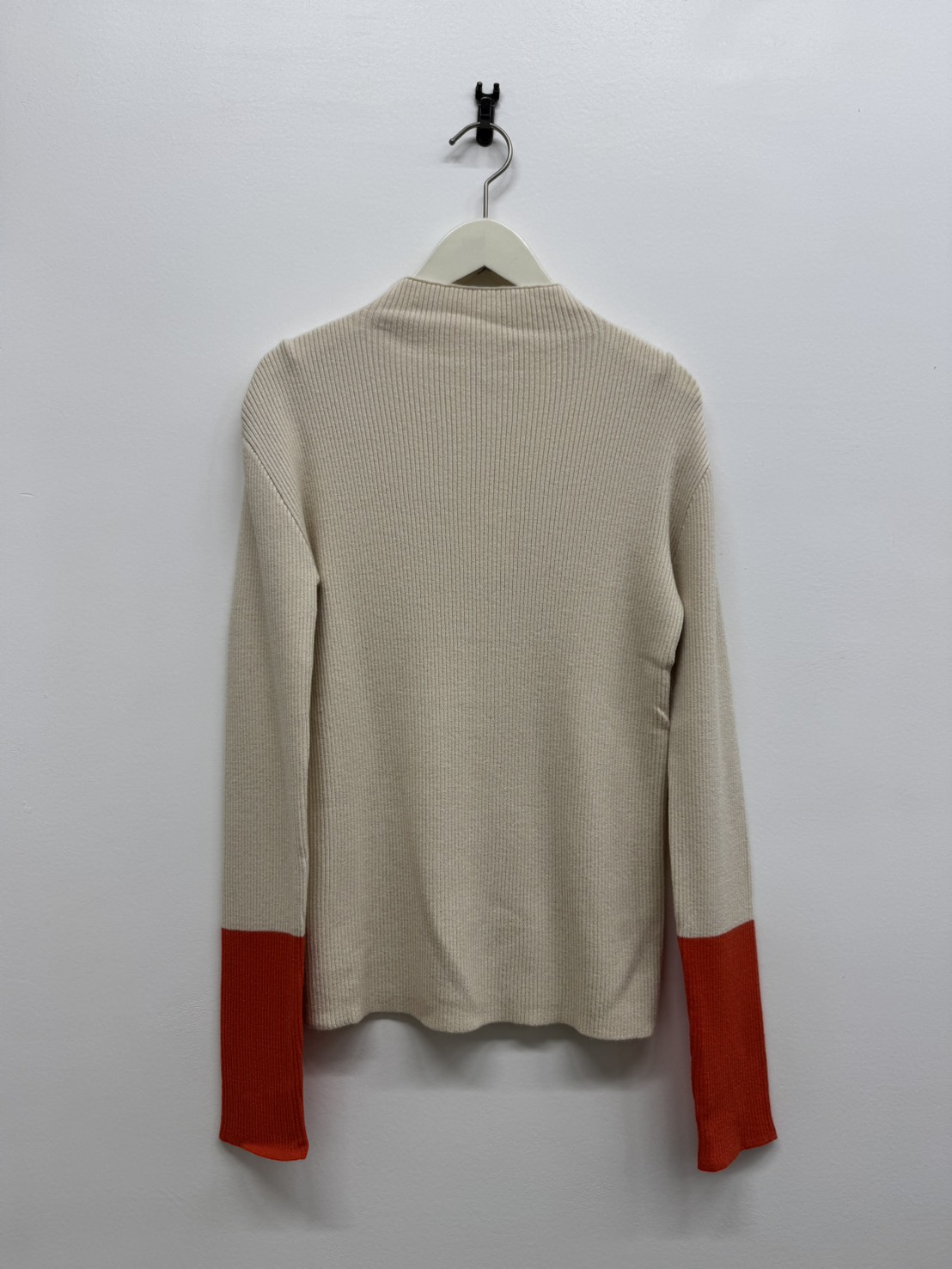 伸縮性の良いリブ編みで、程よくフィットするシルエットがレイヤードコーデにもぴったり。