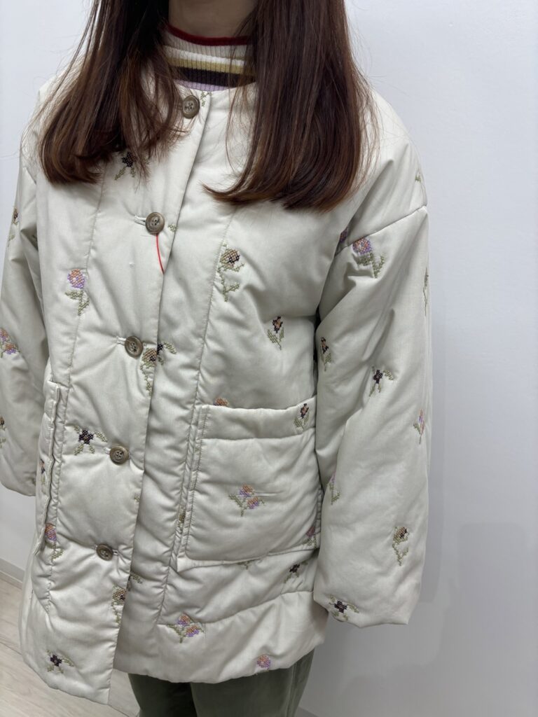 お花の総刺繍を施したキルティングコート。ミドル丈で合わせる服も選びやすく、軽い着心地が◎