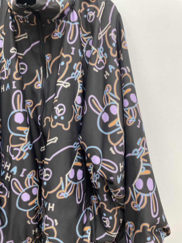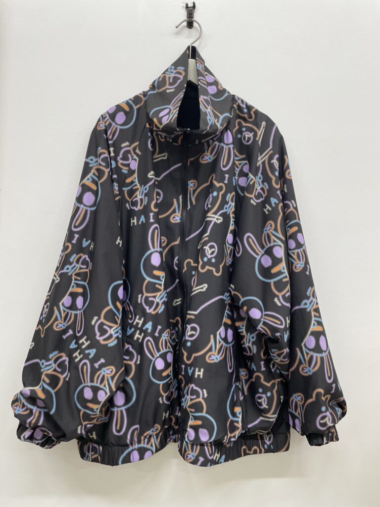 組体操をするクマとうさぎを、ネオンサイン風に表現した総柄プリントのポップでカワいい、リバーシブル仕様の2WAYジャケットです!