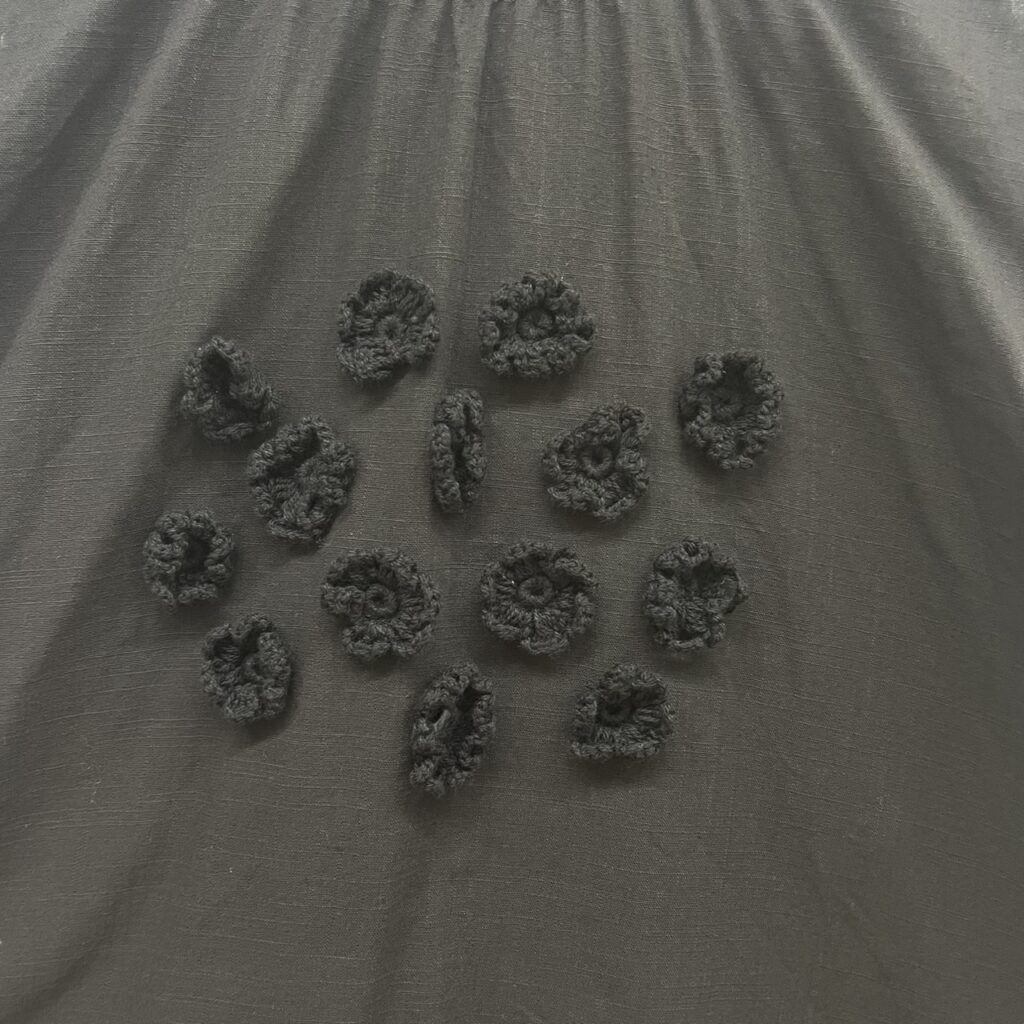 ハンドクラフト感のある手編みのお花モチーフをぱっと気軽に着られる形のTブラウスに乗せてます!