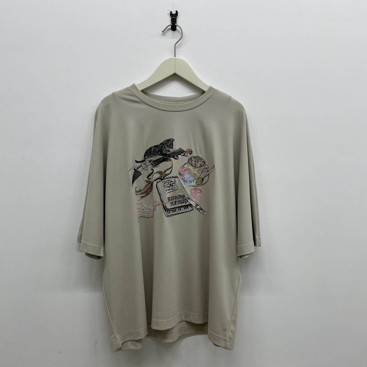 ネコ×作曲刺繍ポンチ生地半袖Tシャツ