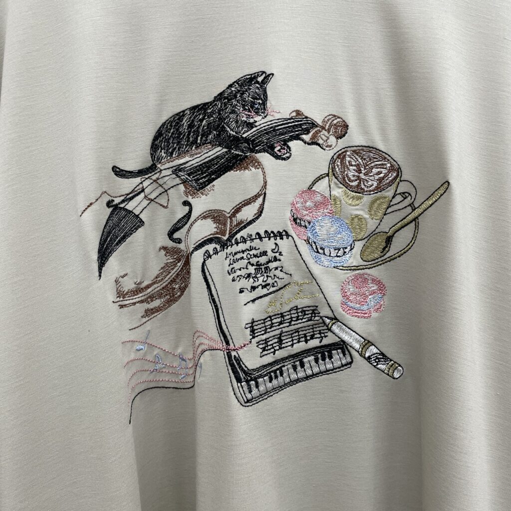 おいしそうなラテとマカロンの横で、作業中の飼い主に遊んでほしそうにバイオリンとじゃれ合う黒ネコ手前には、楽譜に残された歌詞らしきメモ書きが描かれた鍵盤モチーフのノートやペンが並んだ、”作家さんの日常”を切り取ったかのような優しげな雰囲気の刺繍デザインが特徴のTシャツです!