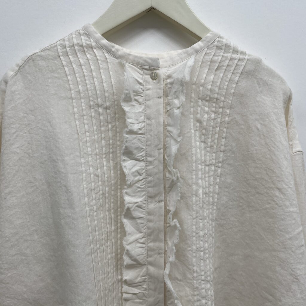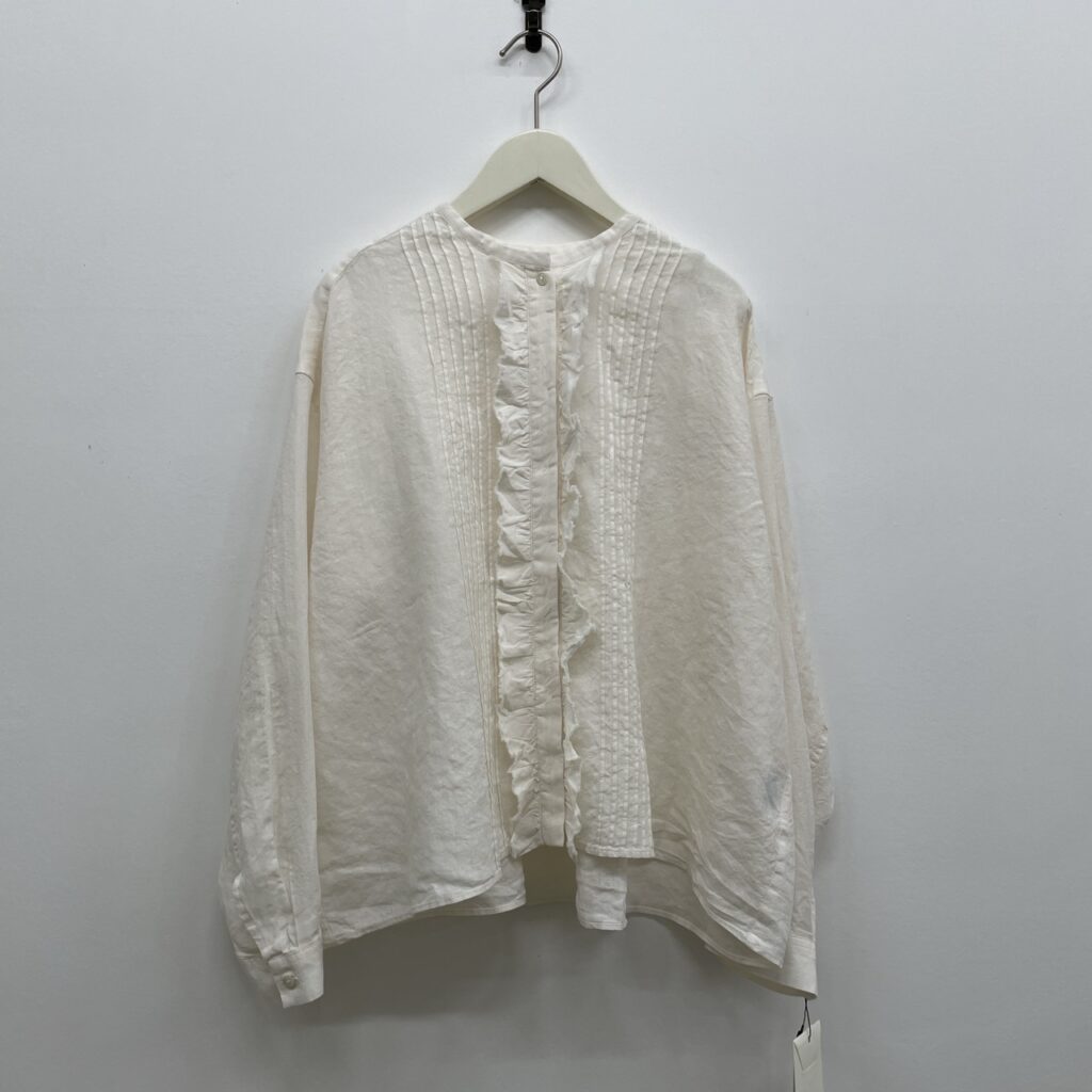 麻素材でプチスタンドカラーに断ち切りフリルとタックで甘くなりすぎない、大人の可愛らしさをくれるブラウスです!