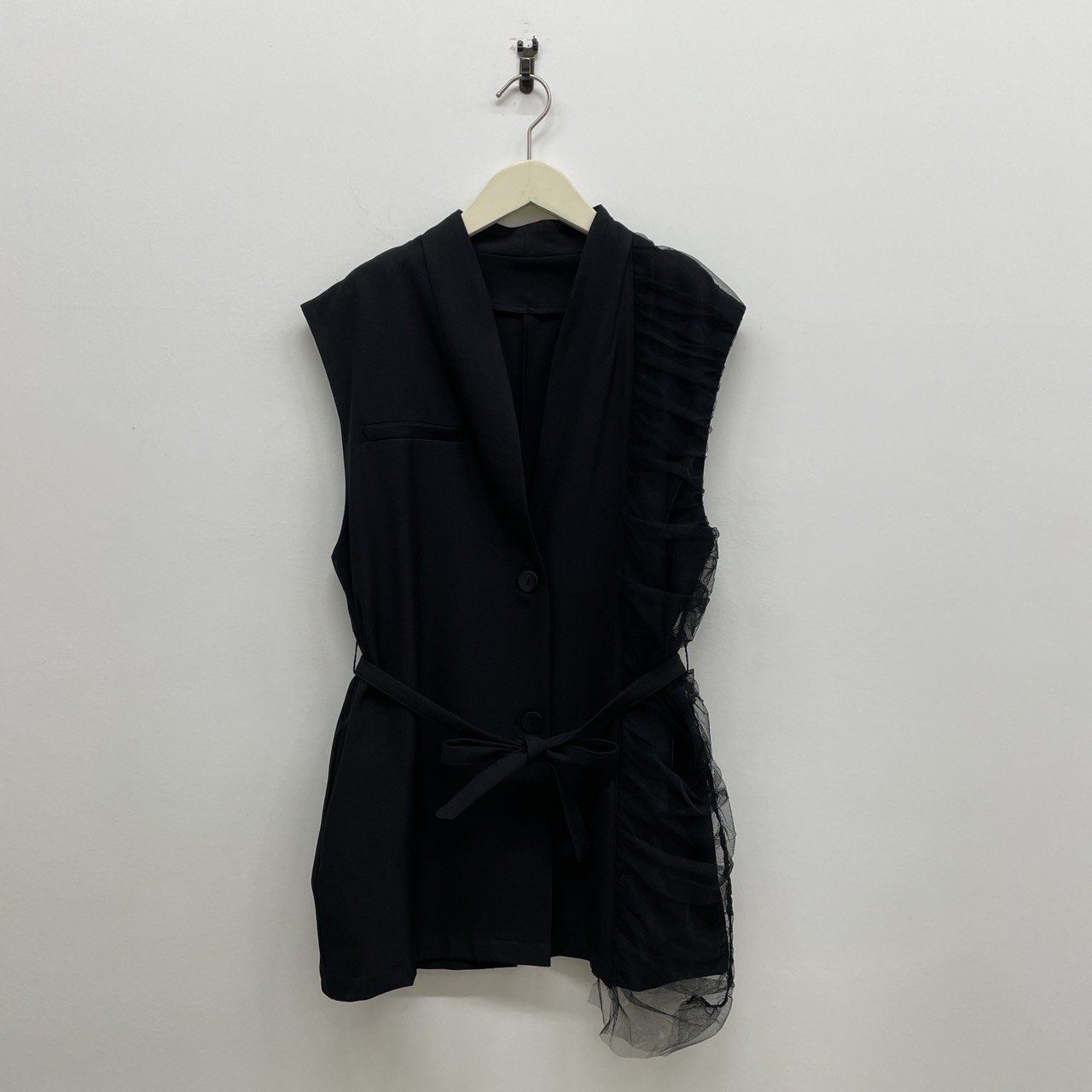 片側はチュール素材で切り替え、他にはない存在感をプラス、アシンメトリーなフォルムがモードな印象をより際立たせます!