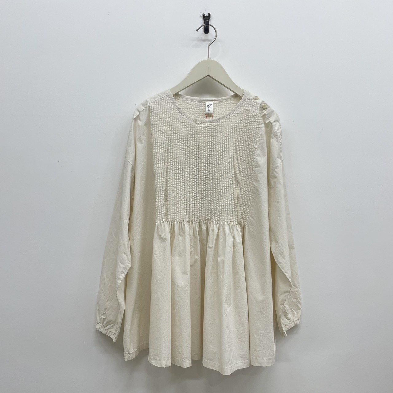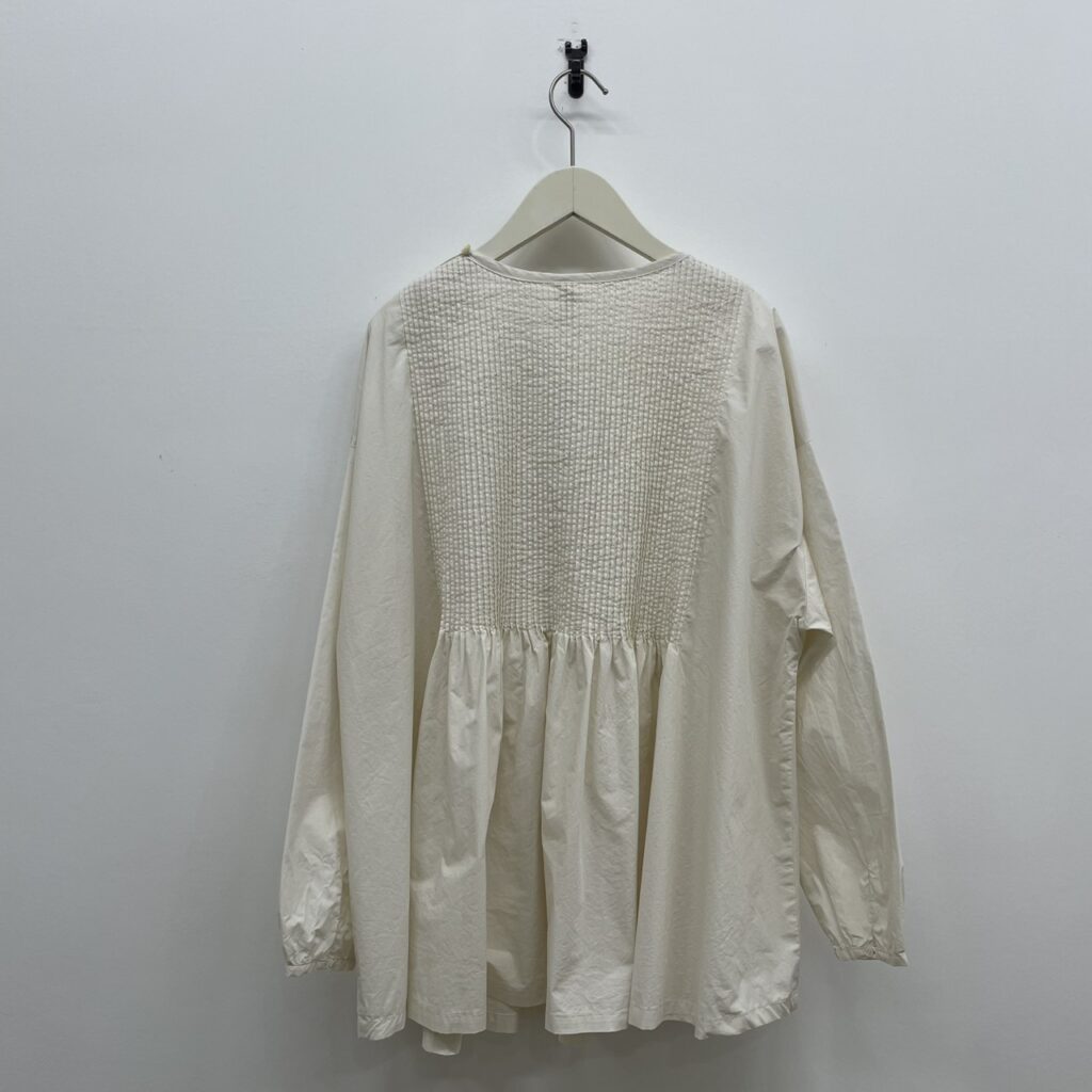 タイプライターのぱさっと肌離れの良い生地でつくったバスクシャツのようなディテールのピンタックブラウス。