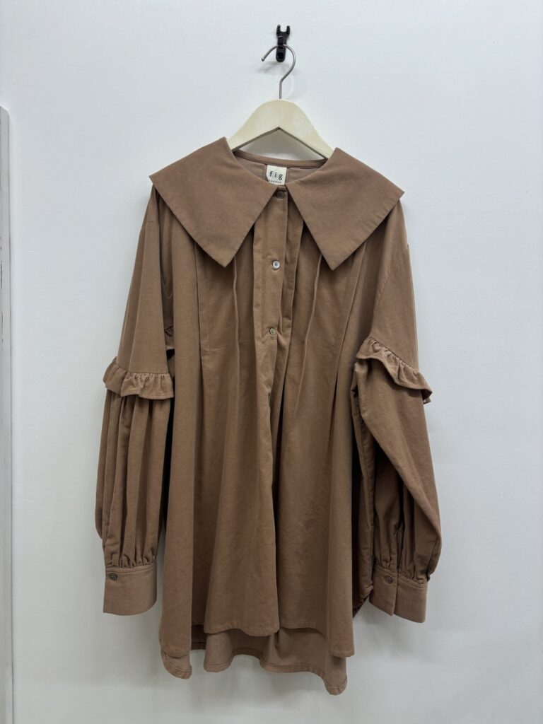 軽く羽織るのにも一枚で着るのにも心強いアイテムです。ブラウスはゆったりしたロング丈でかわいらしすぎず着ていただけます。
