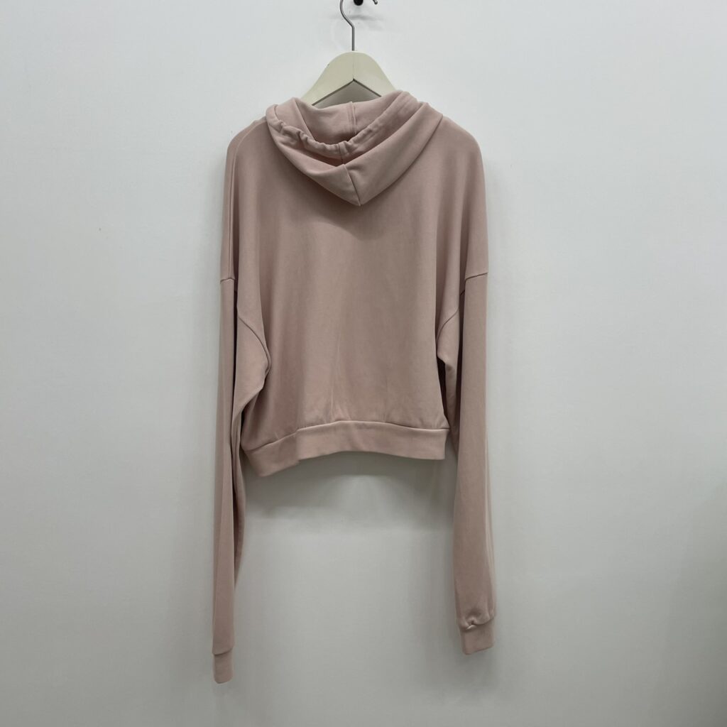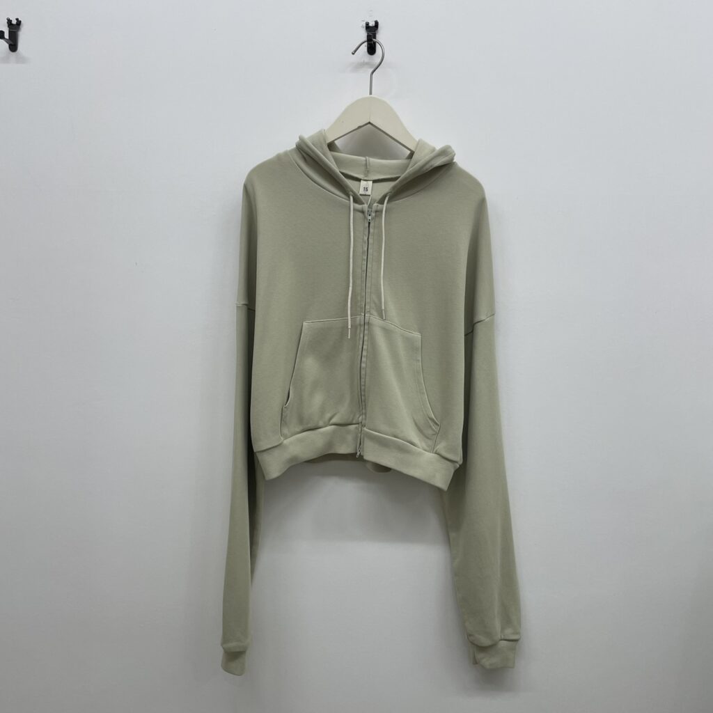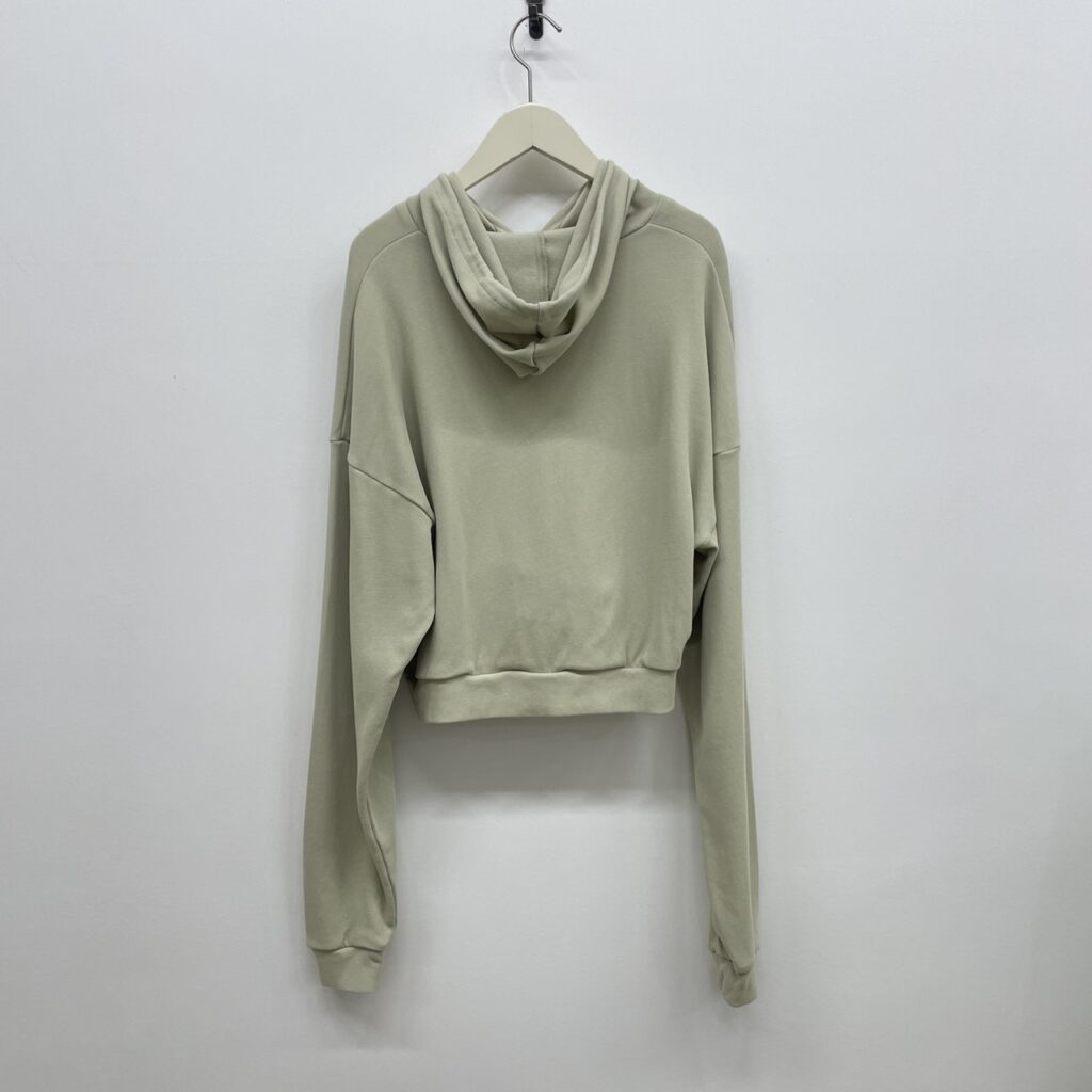 肌触りがさらりとしたショート丈のフーディー。強撚糸を使い編み立てカジュアルすぎない印象にしました。