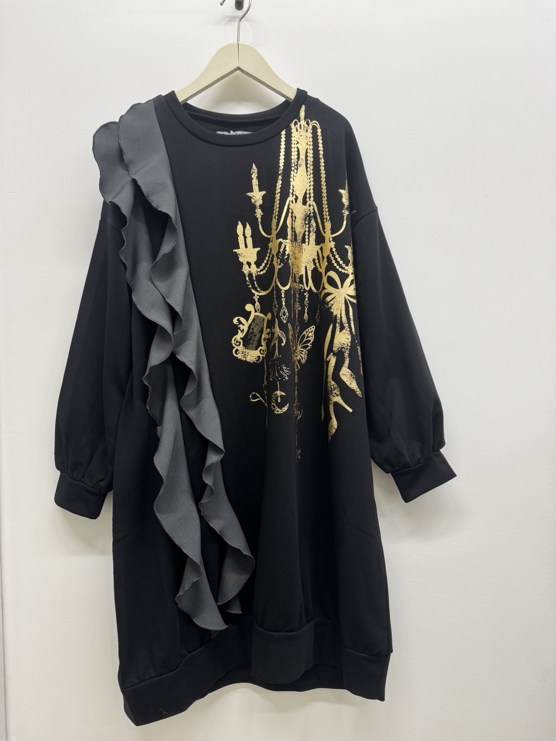 キラッと光る箔プリントのシャンデリア柄が肩に映える、冬らしさ満点のワンピース。