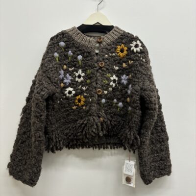 くるくると描いた線をそのまま立体にしたような、鎖編み状につくられたお花のモチーフと刺繍、あたたかい部屋が浮かぶ、ほんのりカントリーでほっこりとした気持ちになるカーディガンです! ほどよい肉感で厚すぎないですがウール...
