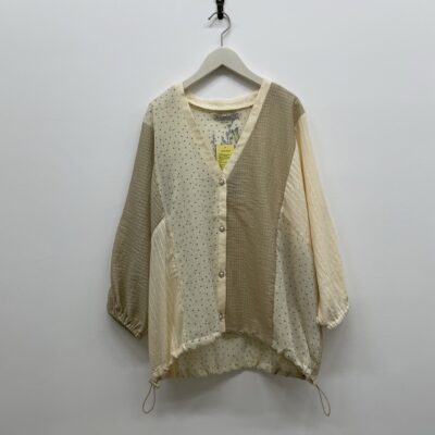 異なる三種類の布帛生地を切り替えた、異素材使いのカーディガンです! よく見るとストライプ・チェック・ドットの柄がミックスされており、 さりげなくデザイナーの拘りが光るデザインに仕上がっています! 後ろ身頃...