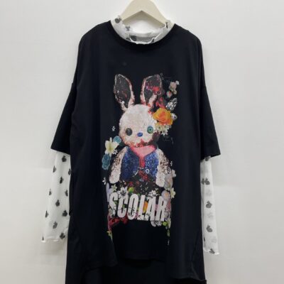 ロックなコーデにも合いそうな、ちょっぴりダークなウサギのぬいぐるみ柄チュニックです! 衿と袖には涼しげなチュール素材が切り替えられており一枚でさらっと着られるレイヤード風のデザインになっているところが魅力です! ...