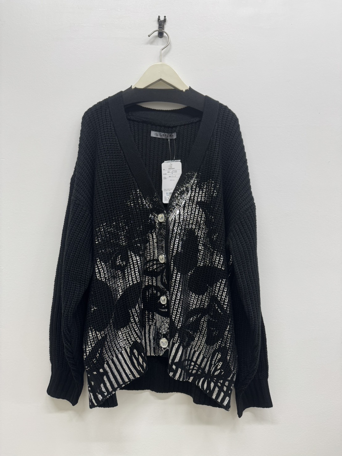 キラリとつやめく箔プリントが目を惹く、アクセント使いが美しいニットカーディガン。光を受けるたび、見る角度によって表情を変える上品なきらめきが魅力です。