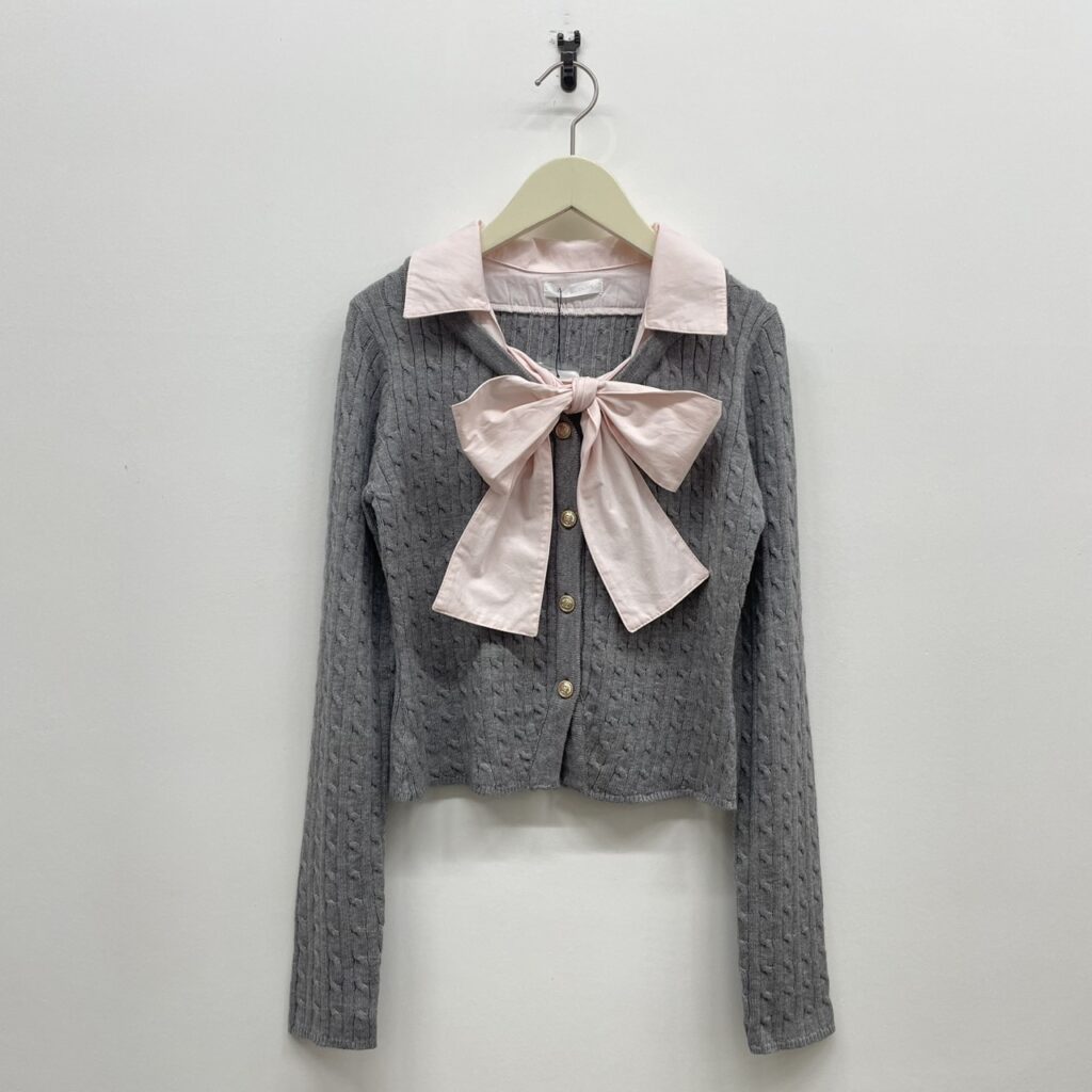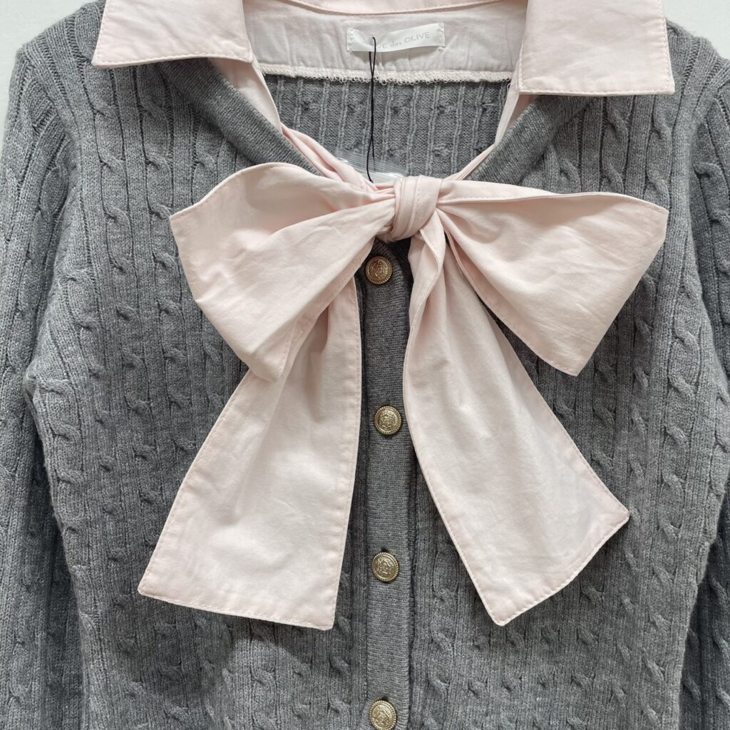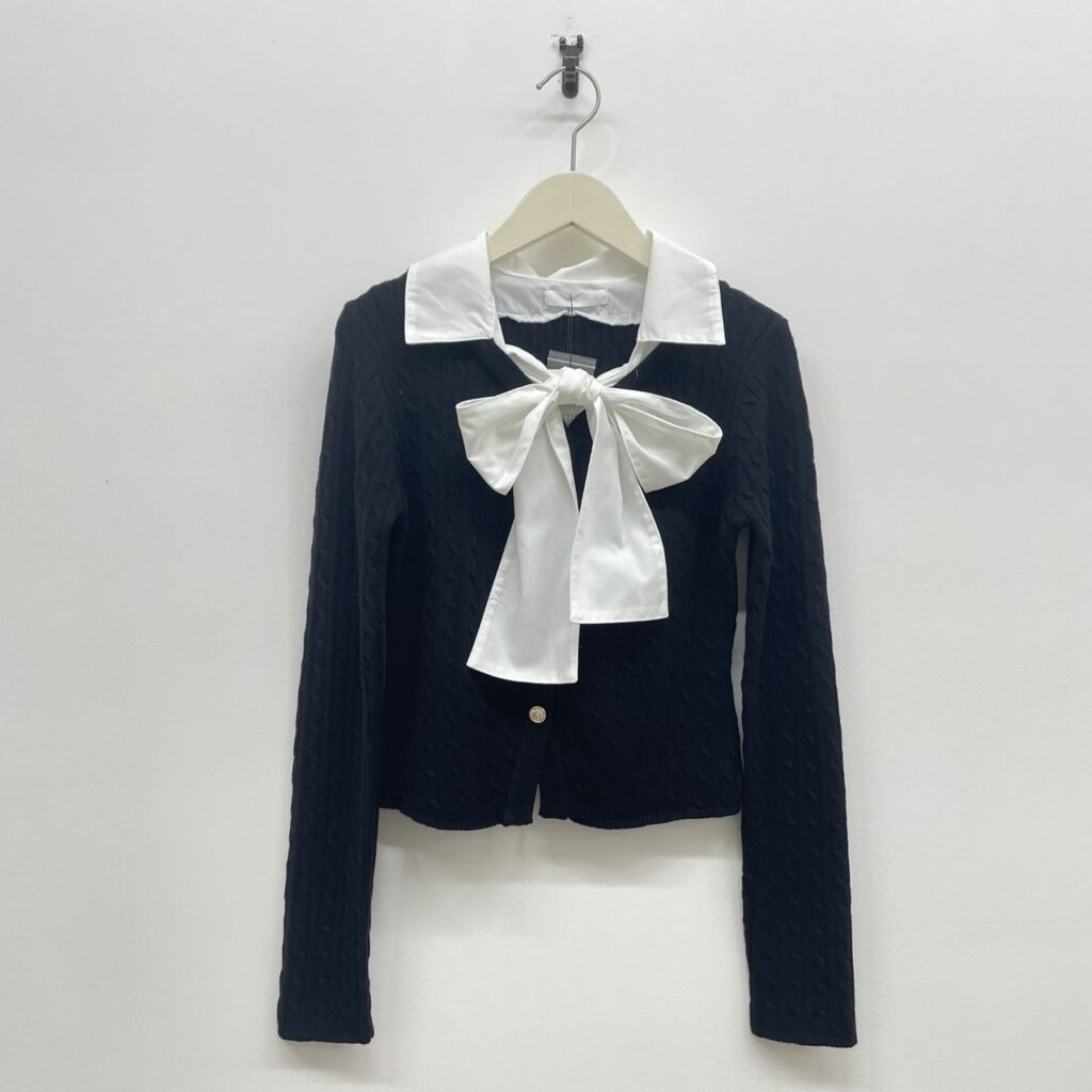 大きなリボンとシャツ襟が、顔周りを華やかに見せてくれるデザイン。