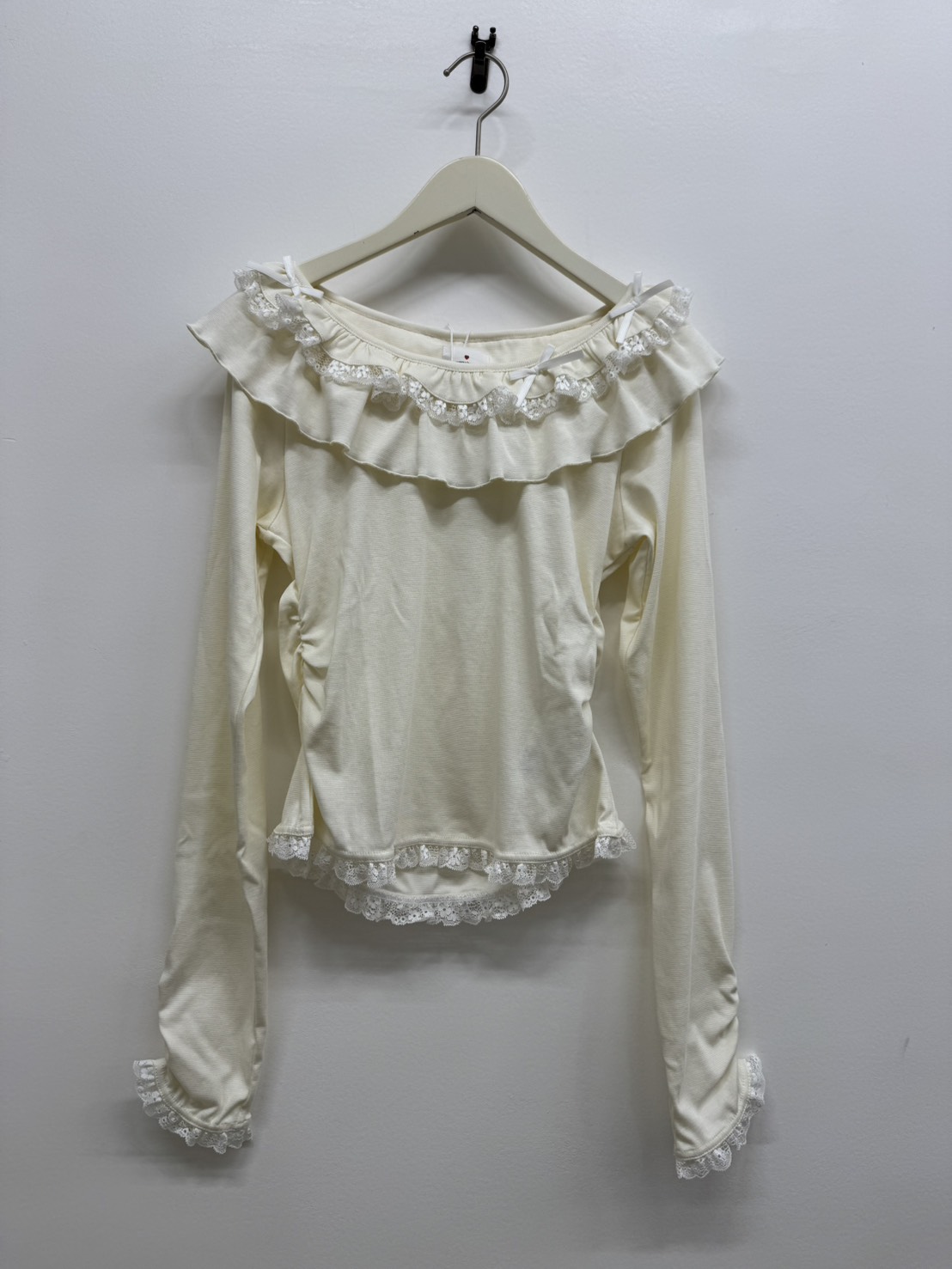 鎖骨がチラッと見えるすっきり感と、リボン&ふりるのデコラティブなバランスでデイリーに活躍できちゃうアイテム!