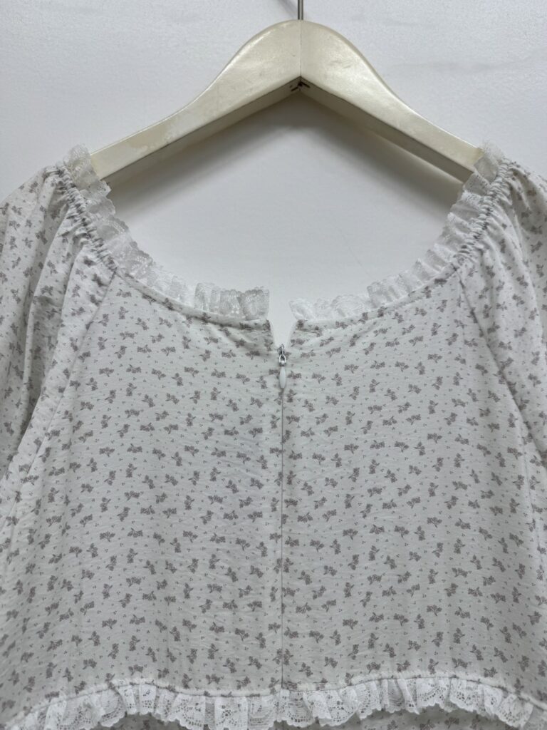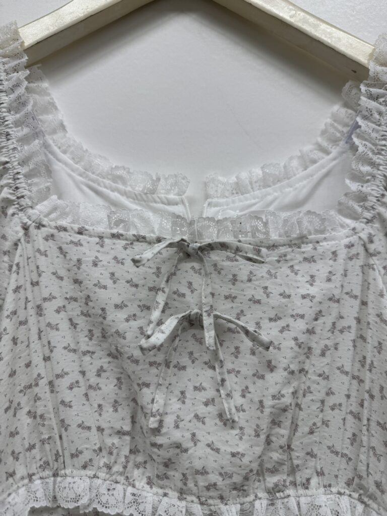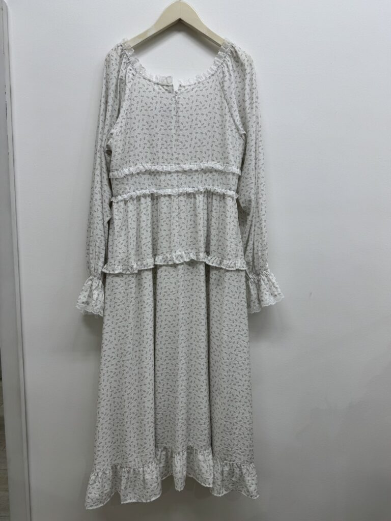 春の小花柄が可憐なワンピース。すっきりとした首元に、軽やかなレースとリボンを添えて、やさしい印象に仕上げました。