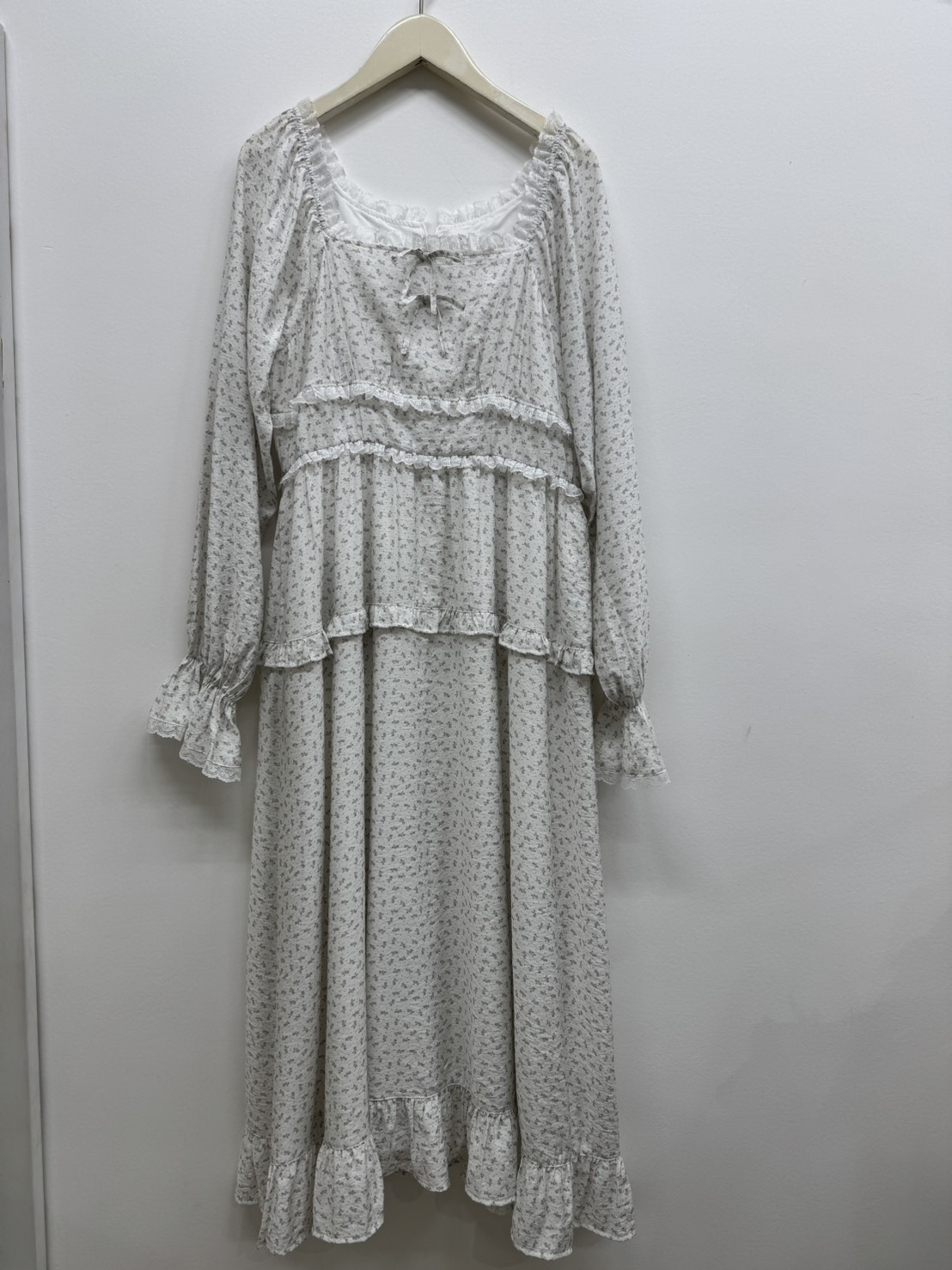 春の小花柄が可憐なワンピース。すっきりとした首元に、軽やかなレースとリボンを添えて、やさしい印象に仕上げました。